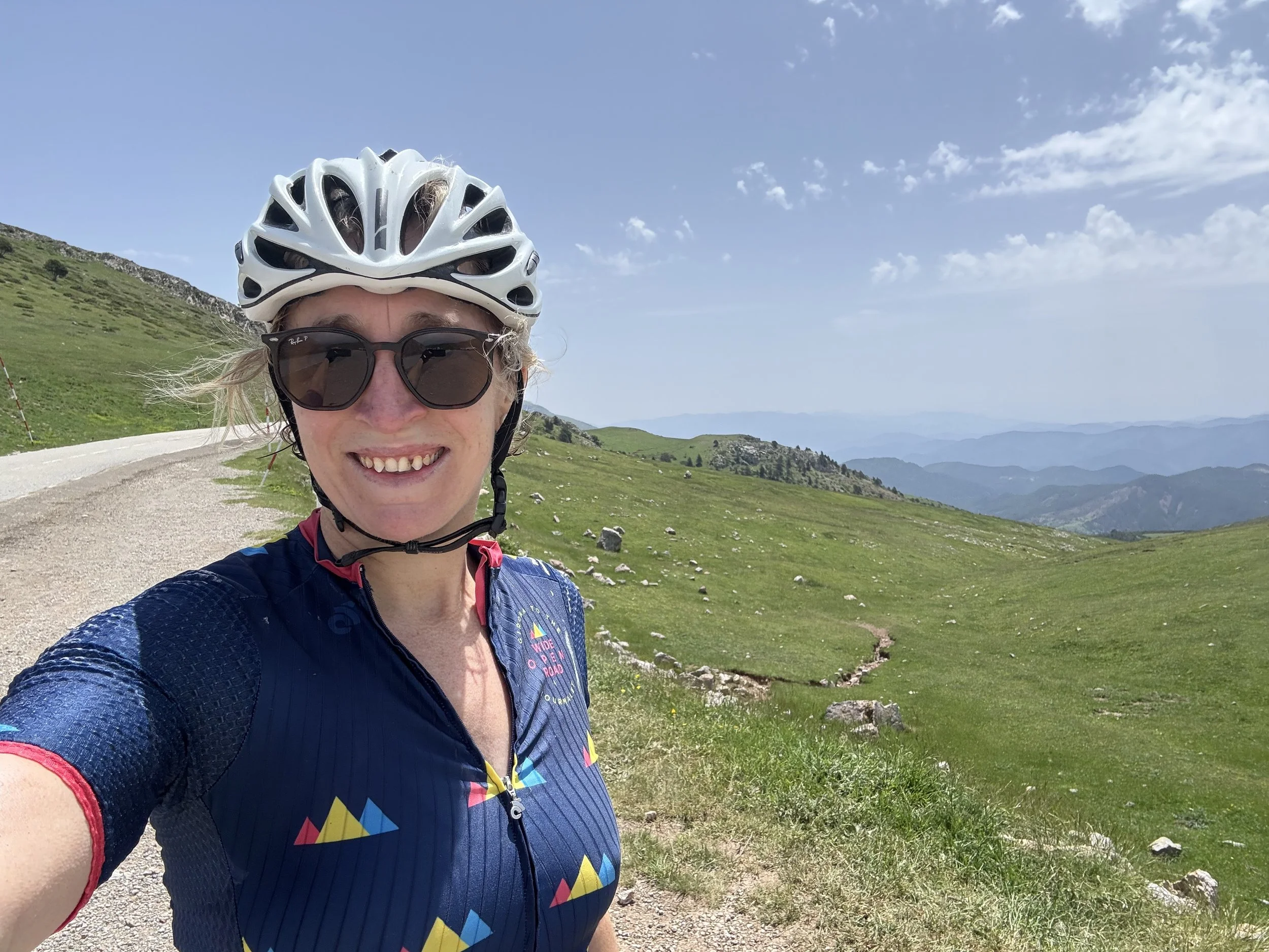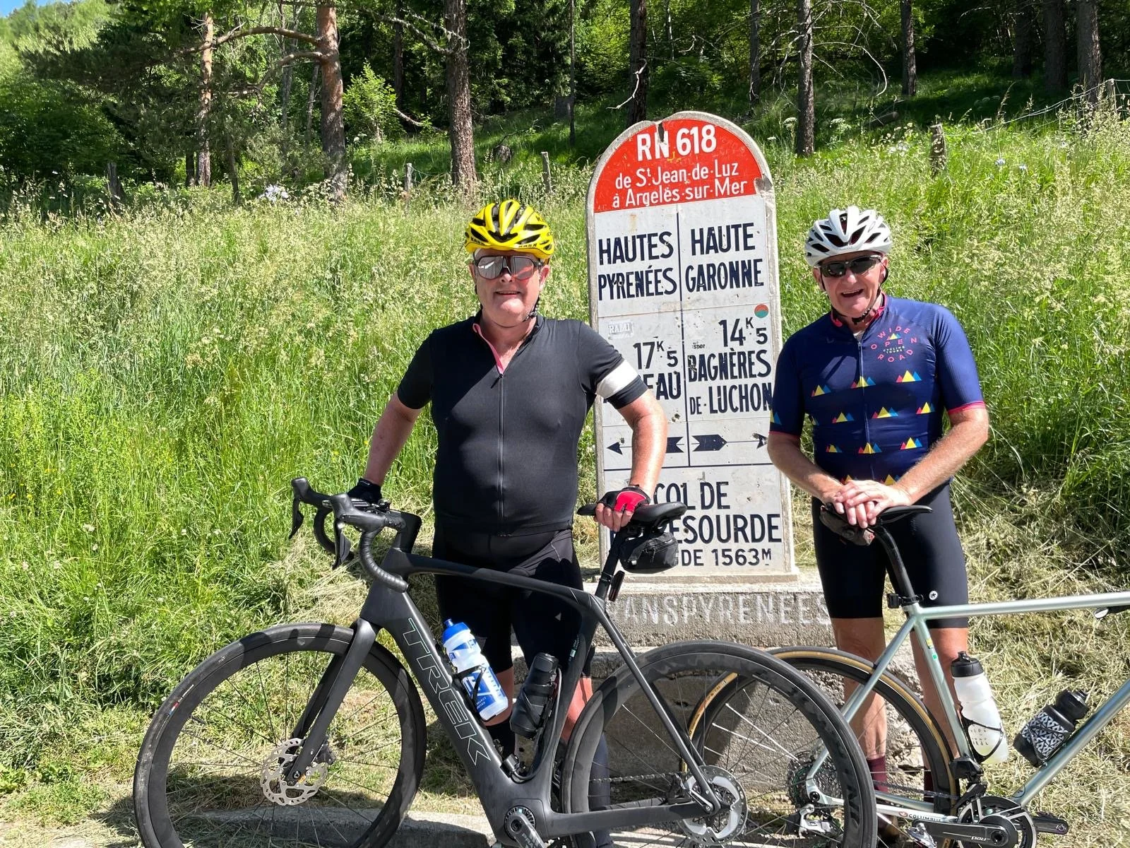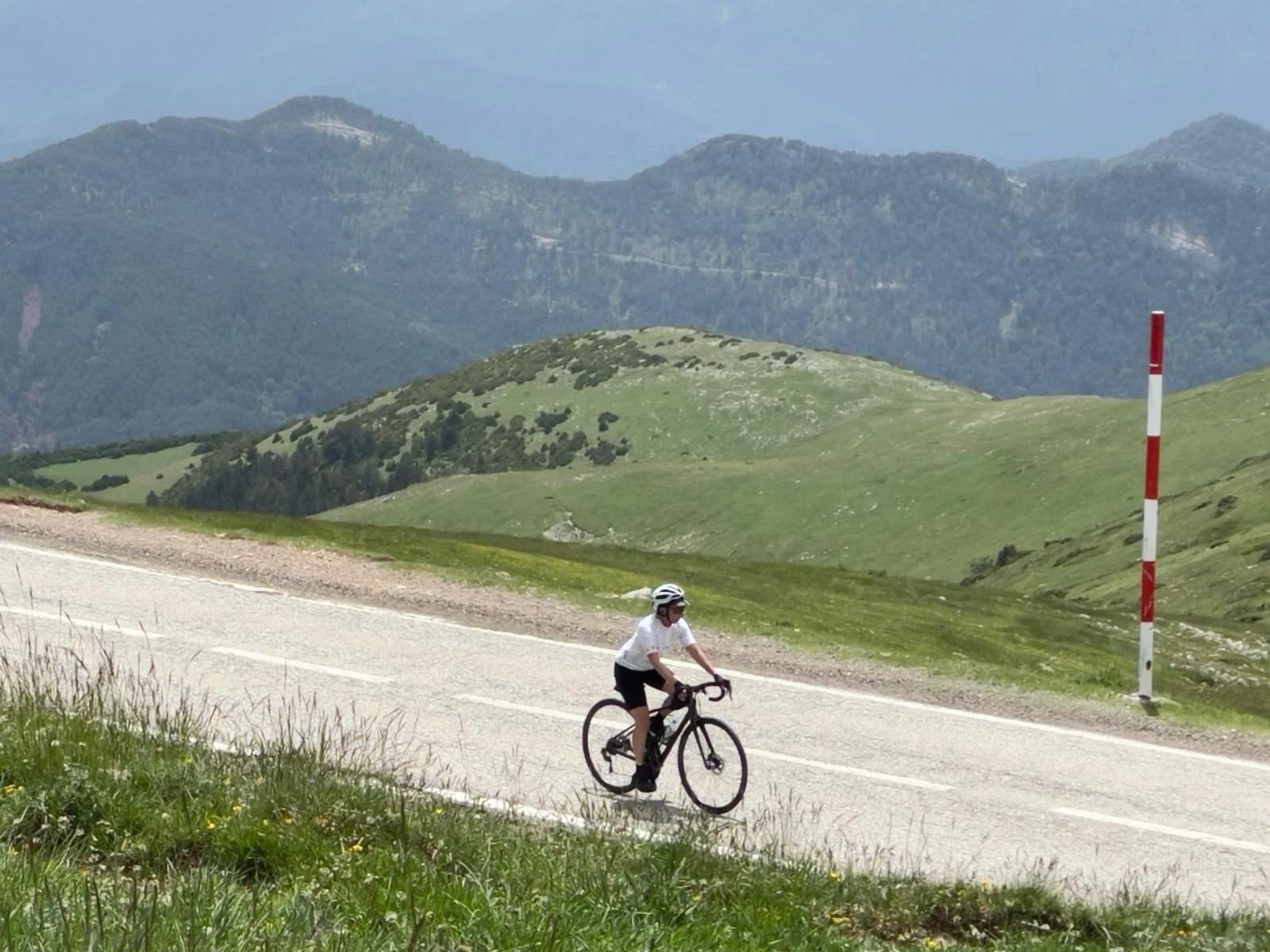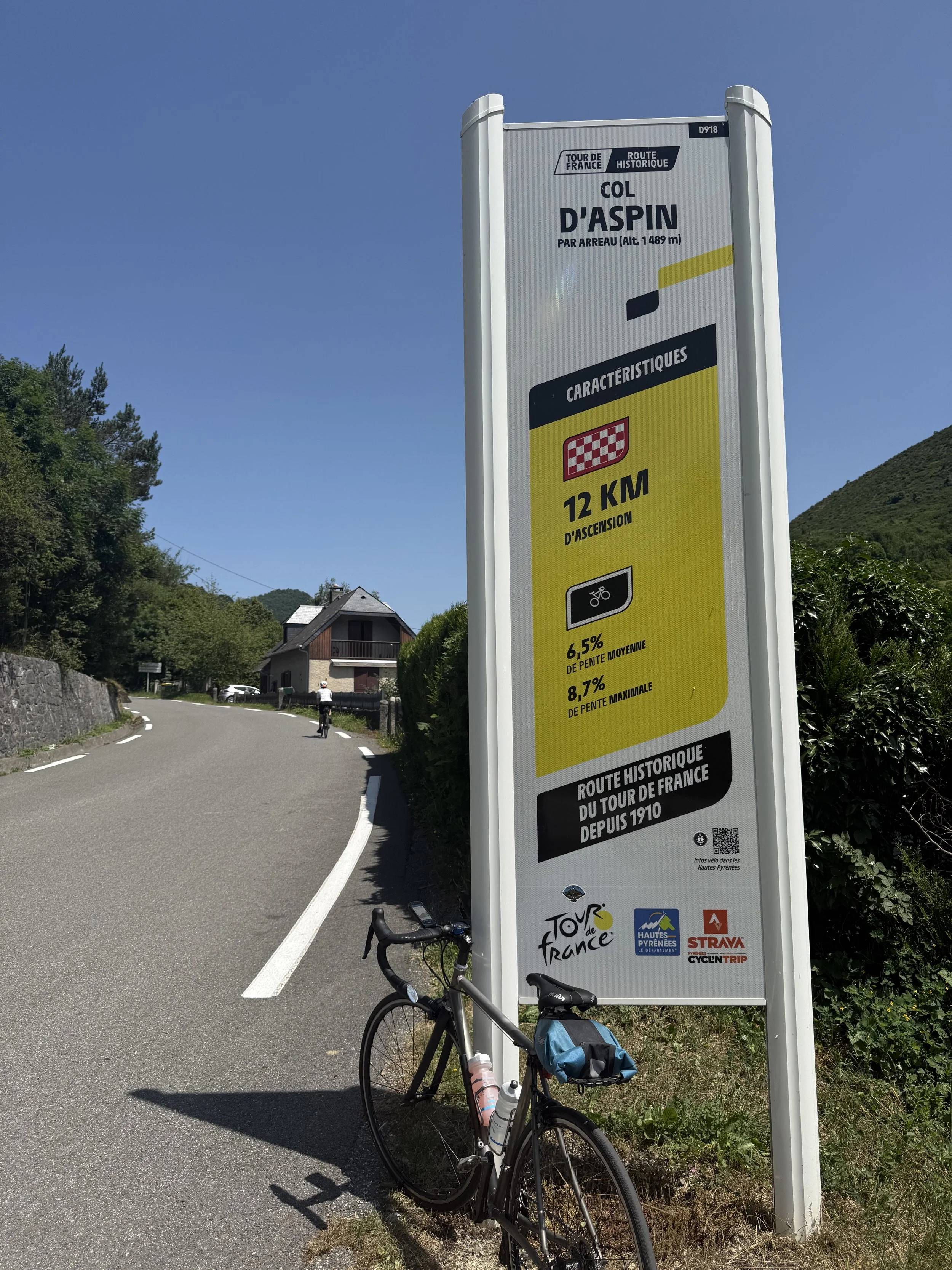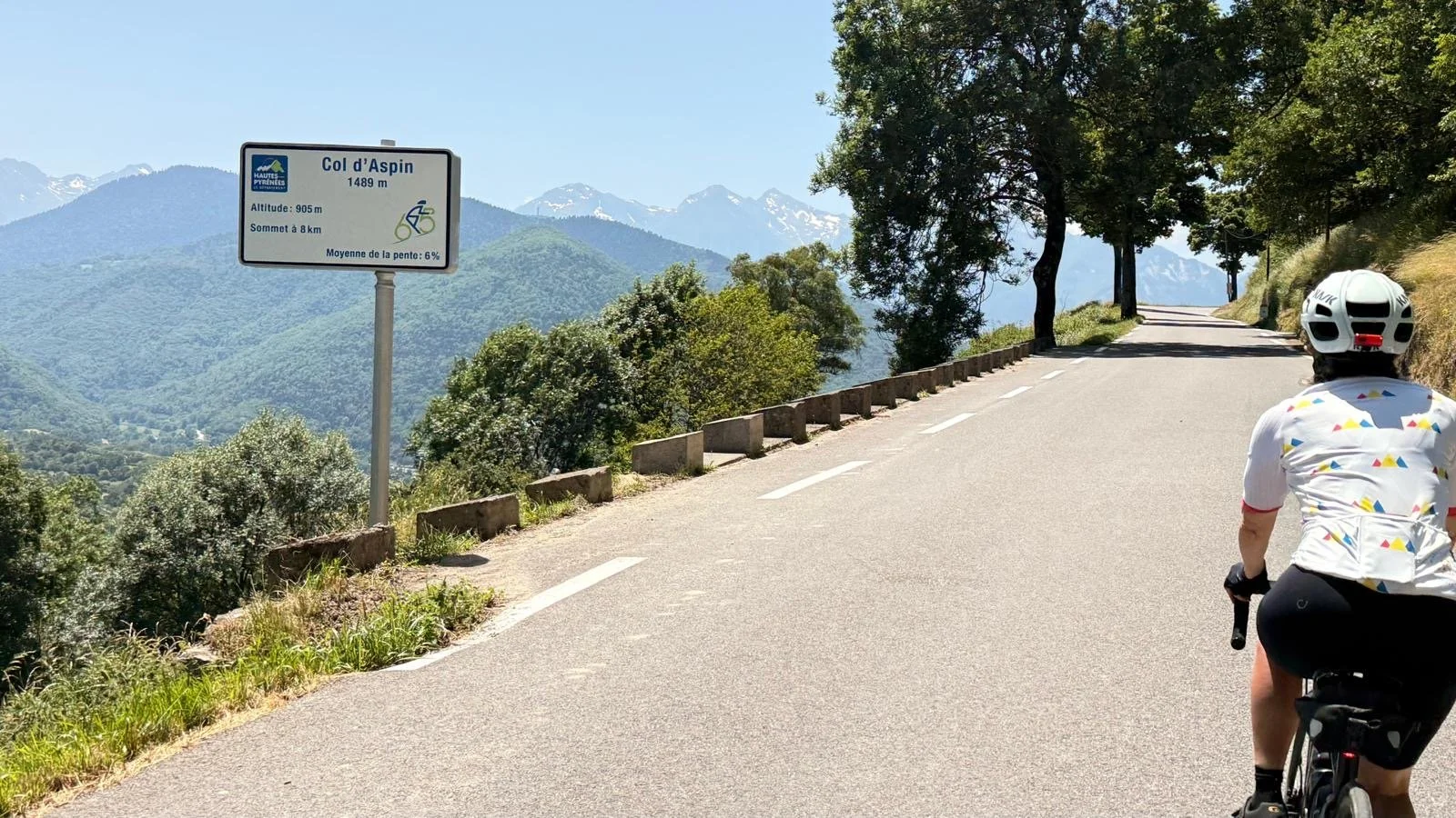 Liz on the iconic Col d’Aspin - the road and trees unmistakable