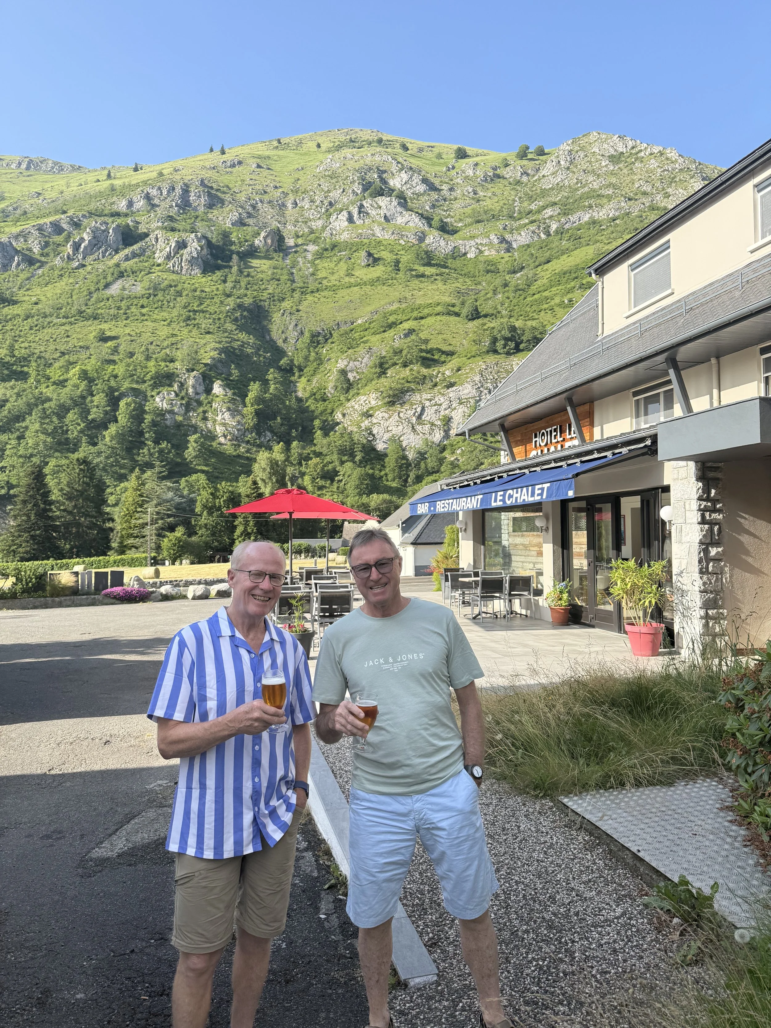 Another 2 night stop welcome – with many of the group riding the spectacular Superbagneres in the morning and Nick continuing his ‘extras’ with the tough climb to the Port de Bales. A surprise birthday in the evening for one of our crew (thanks for the Prosecco, Ged and Ed!).