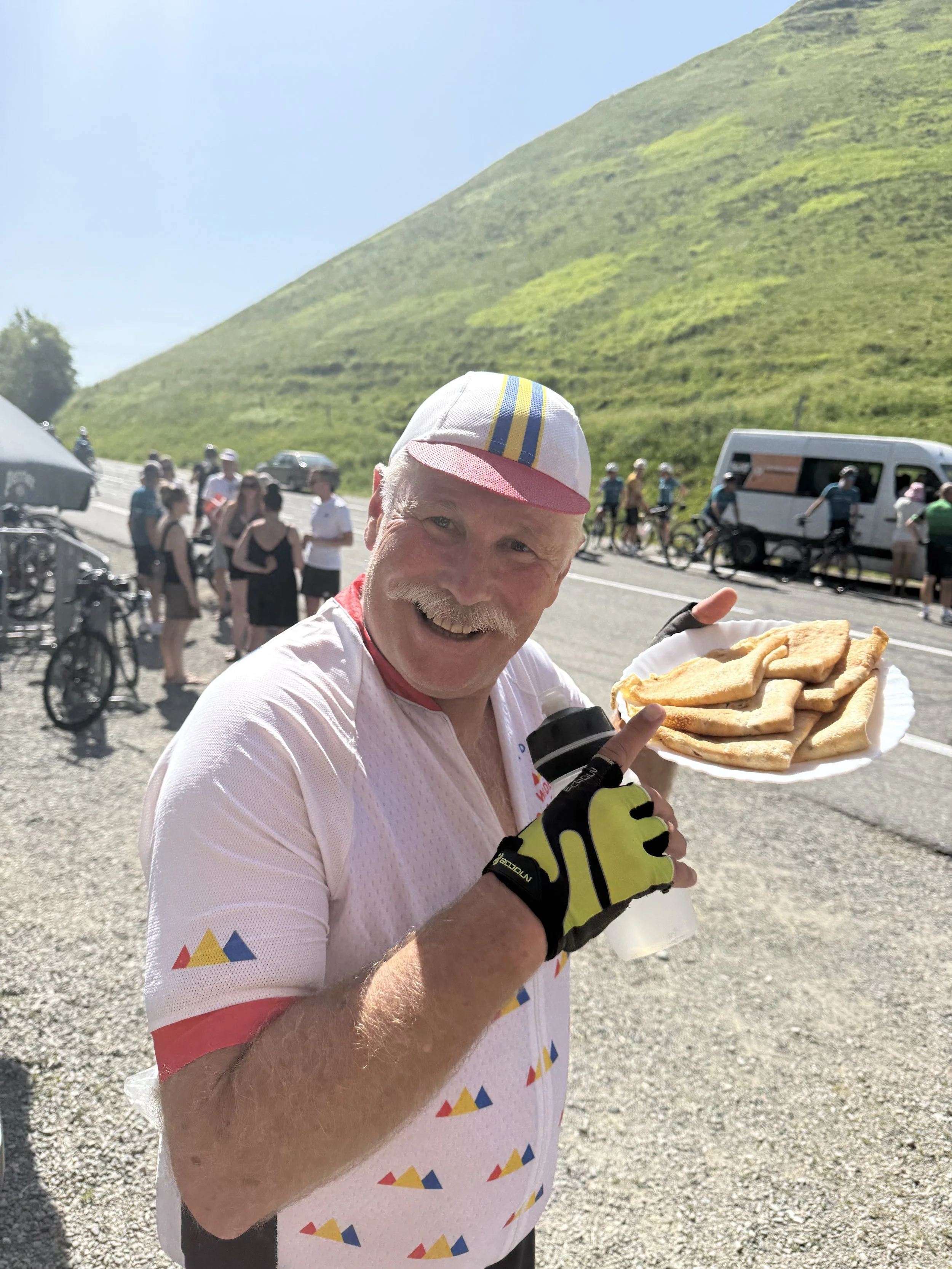 A classic WOR double – the Peyresourde/Aspin on our penultimate day, always a favourite. We cycled the Col du Peyresourde – always one of my favourite climbs for the stunning hairpins and windy road at the top – with about 1000 cyclists completing a MS Charity Ride – their blaring music and cheer-squad somewhat destroying the peaceful atmosphere of the mountains. Despite that, the queue wasn’t too long for the famous Crêpes at the top – de rigueur for any cyclist. I managed to eat 4 and shared a few more plates with the group (and Max and Leo who I think ate the most!).