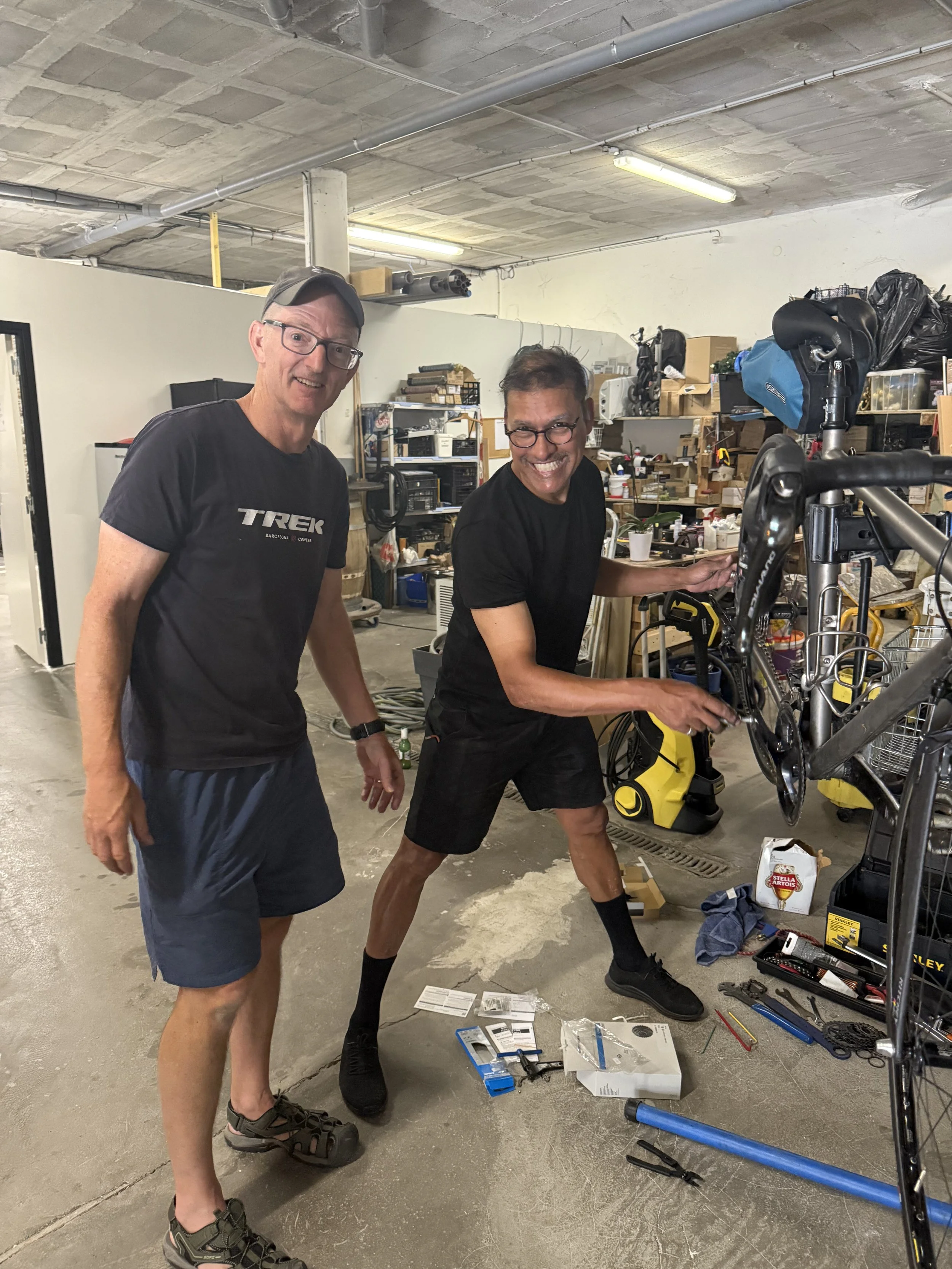 Mal and Alfie working on bikes in Luchon!