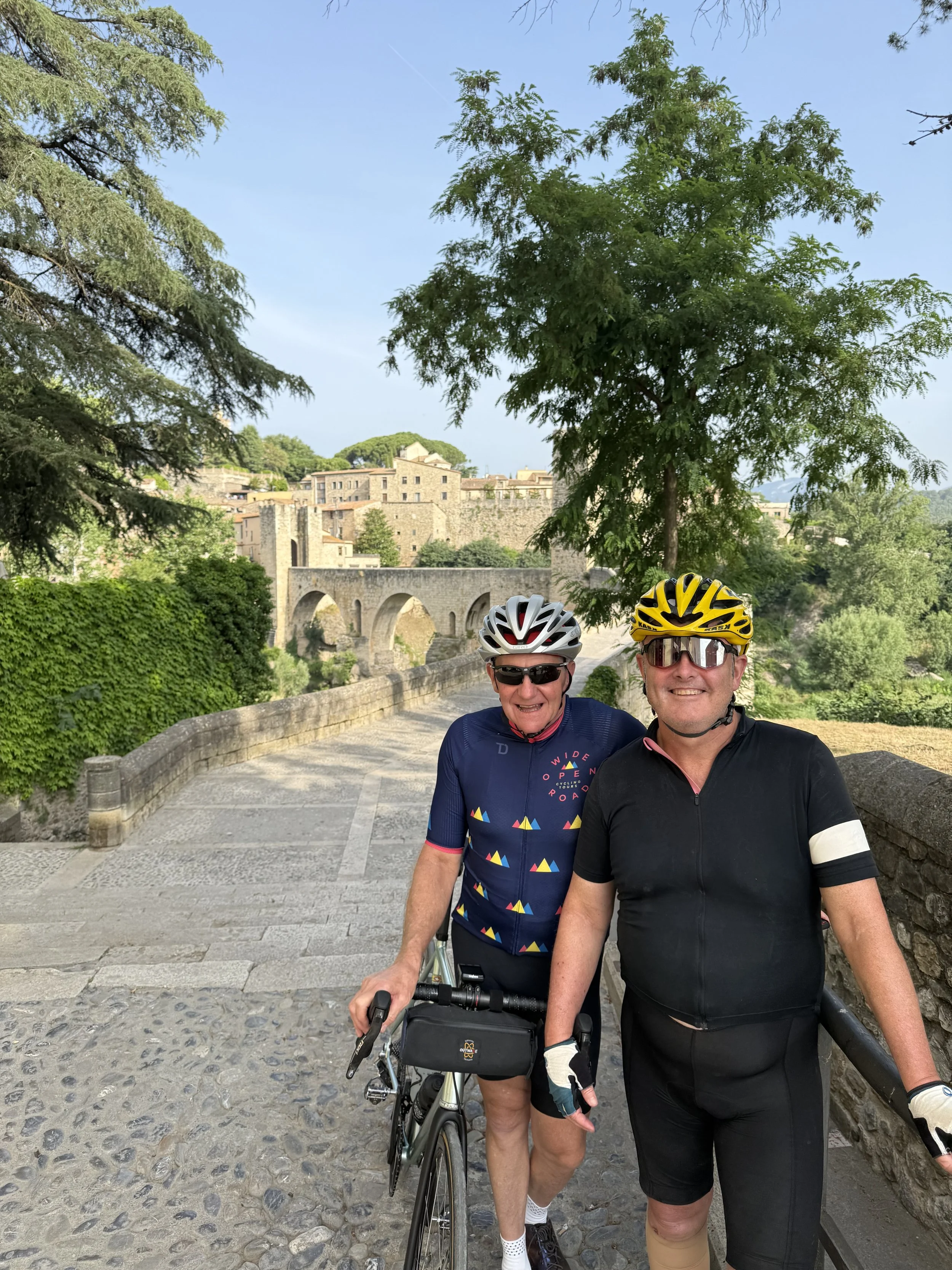 Our first tough climb took us to the Monestir de Sant Pere de Rodes – a trip down memory lane for Geoffrey, re-creating a photo of himself as a young boy. Figueres for lunch and onward to climb Mar del deu del Mont – part way or all the way for some strong climbers of the group (chapeau). Dinner at a beautiful restaurant overlooking Besalú’s Pont Fortificat with some of the best food (a memory for me the Bacalhau à Bràs - eggs and cod – a Catalan specialty) and wine of the Tour.